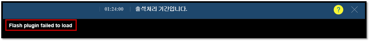 Internet Explorer 환경에서 영상 학습 시 이미지와 같이 'Flash plugin failed to load' 문구의 오류가 나타나면서 재생이 안될 경우 다음과 같이 설정합니다.