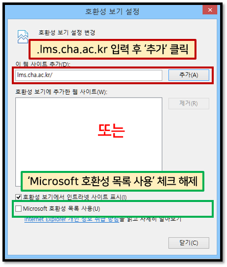 3. '이 웹 사이트 추가' 항목에 lms.cha.ac.kr를 입력 후 추가 버튼을 클릭합니다. (또는 아래의 'Microsoft 호환성 목록 사용' 항목의 체크를 해제합니다)
